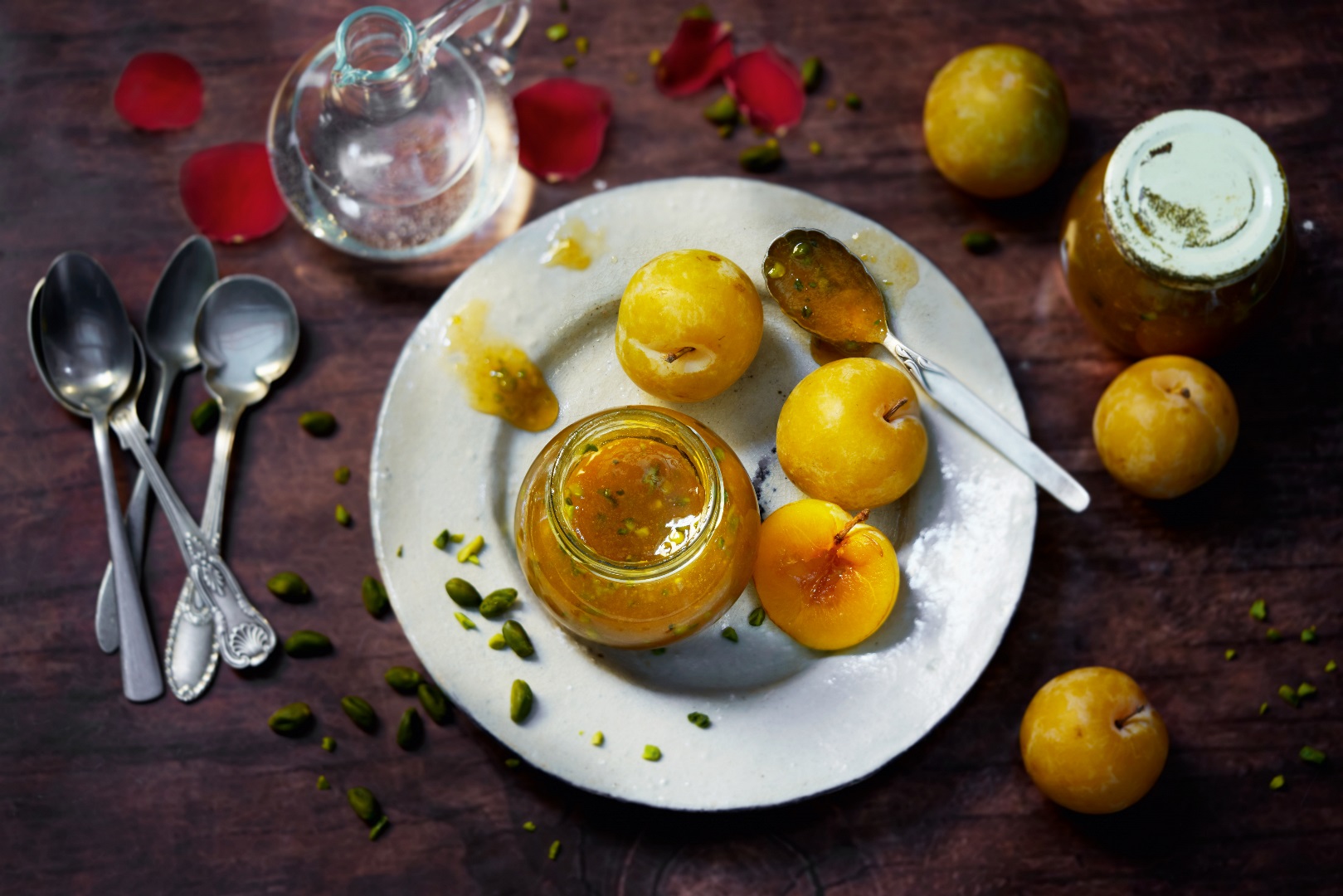 Gelbe Pflaumen Konfiture Mit Rosenwasser Und Pistazien